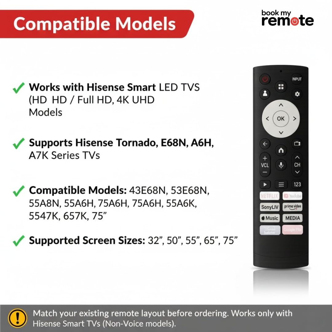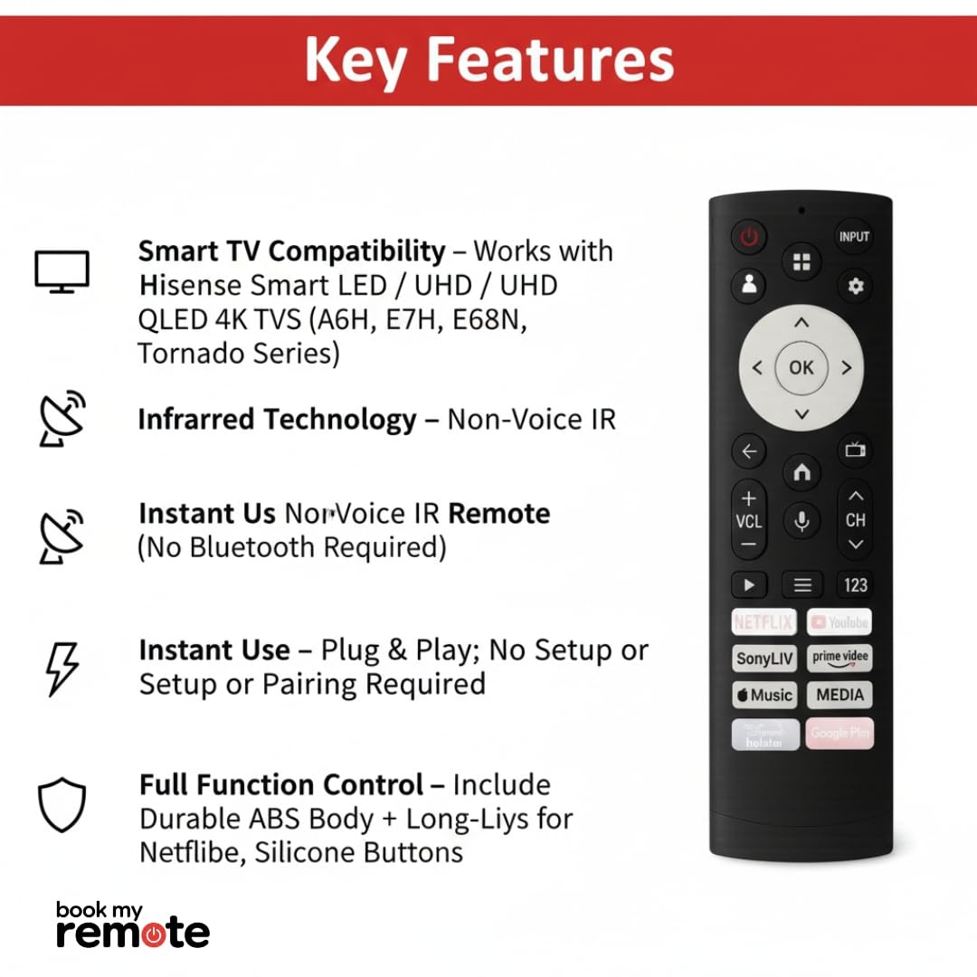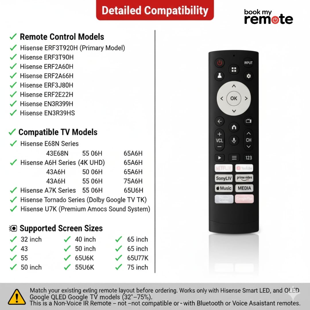 Upgrade your TV control experience with Book My Remote, the ultimate replacement remote compatible with Hisense ERF3T920H and multiple Hisense Smart TV models. Designed to deliver the same feel and functionality as the original Hisense remote, it ensures seamless compatibility, plug & play convenience, and durable performance for everyday use. | Unlike other generic remotes, this model is precisely designed for Hisense televisions, including the popular E68N, A6H, A7K, A7H, and Tornado Series Smart TVs. Its built to work instantly without pairing, ensuring full control of all your TV functions the moment you insert the batteries. | Key Features & Highlights | Seamless Compatibility Works Perfectly with Hisense TVs | Compatible with the following Hisense models and remote versions: | Series: Hisense E68N, A6H, A7H, A7K, Tornado, A62E, E6G, E6H, and other Smart/Android TVs | Supported Models: 32E68N, 40E68N, 43E68N, 50E68N, 55E68N, 65E68N, 50A6H, 55A6H, 65A6H, 43A6H, 55A7K, 65A7K, 55A7H, 65A7H, 75A6H, 43A7H, 55A7H, 75A7K, etc. | Compatible Remote Models: ERF3T920H, ERF3T90H, ERF3R69H, ERF2F60G, and other Hisense non-voice remotes. | Fully functional with Hisense 32 inch, 40 inch, 43 inch, 50 inch, 55 inch, 65 inch, and 75 inch TVs. | Plug & Play No Setup or Pairing Required | No complicated programming or syncing needed. Just insert 2 AAA batteries (not included) and start controlling your Hisense television instantly. Works flawlessly with Hisense Smart TVs, 4K Ultra HD TVs, Android TVs, and LED TVs. | Premium Quality & Long-Lasting Build | Built with high-quality ABS plastic and soft silicone rubber keys, this remote ensures smooth button feedback and long-term durability. Each unit is machine-tested before dispatch to guarantee quality and performance. | Dedicated Streaming Shortcuts | Includes hotkeys for Netflix, YouTube, and Prime Videogiving you instant access to your favorite entertainment apps with just one click. Navigate your Hisense Smart TV easily and enjoy faster access to streaming content. | Ergonomic & Lightweight Design | Comfortable to hold, easy to operate, and perfect for long use. The curved ergonomic shape fits naturally in your hand, while the responsive buttons make channel surfing and volume control effortless. | Stable IR Signal Fast Response Time | Delivers quick, accurate, and reliable signal transmission for seamless performance. Strong infrared range ensures the remote works perfectly from any angle, even from a distance. | Battery Operated Ready to Use | Operates on AAA Alkaline batteries (not included). Always use new, high-quality batteries for the best and longest performance. | Perfect Replacement for Your Hisense TV Remote | This Book My Remote model replaces original and lost Hisense remotes for multiple series: | Hisense Tornado Series | Hisense A6H Series | Hisense A7K Series | Hisense A7H Series | Hisense E68N Series | Hisense E6G / E6H Series | Hisense Android & Smart TV Series | Whether you own a Hisense LED, LCD, UHD, QLED, or 4K TV, this remote is designed to match original performance with zero setup.