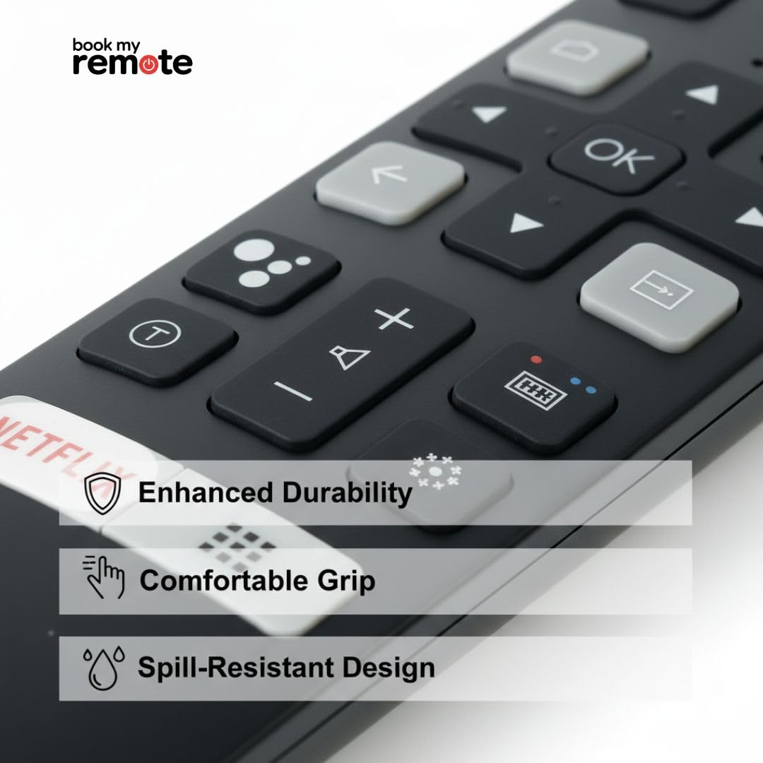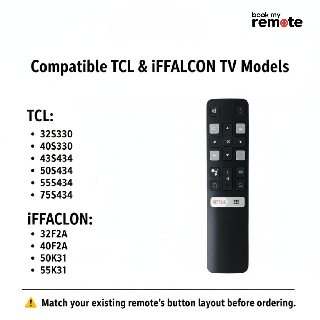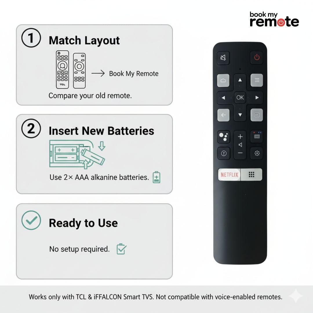 Take charge of your entertainment again with Book My Remote — your perfect replacement remote for TCL and iFFALCON Smart Android TVs. Whether your original remote stopped working or got misplaced, this one brings everything back to life instantly. Designed to mirror the RC802V series (including RC802N, RC802S, RC802V-06, and RC802V-08), this remote control delivers smooth navigation, fast response, and intuitive control — without the need for Bluetooth or voice assistant pairing. With infrared plug-and-play technology, setup takes seconds — just add batteries and you’re ready to go. Built for daily use, its ergonomic design and long-lasting silicone buttons ensure durability, comfort, and effortless performance for years to come. Every Book My Remote undergoes electronic testing before shipment, guaranteeing quality you can depend on. Experience easy control, instant response, and the familiar feel of your original remote — all at an unbeatable value. ✨ Book My Remote – Control Made Simple, Reliable, and Built for TCL.