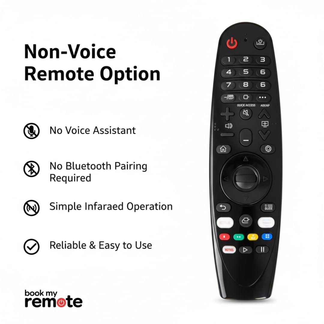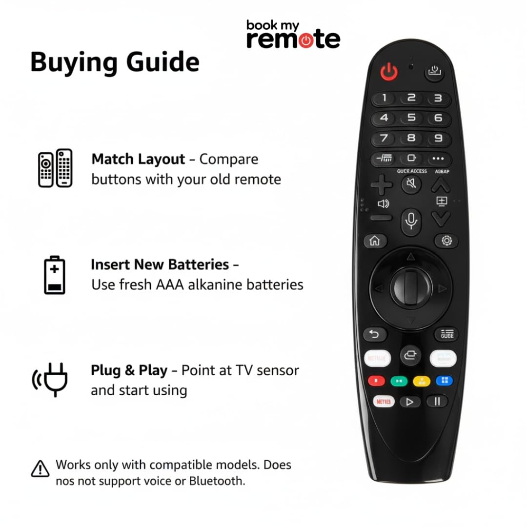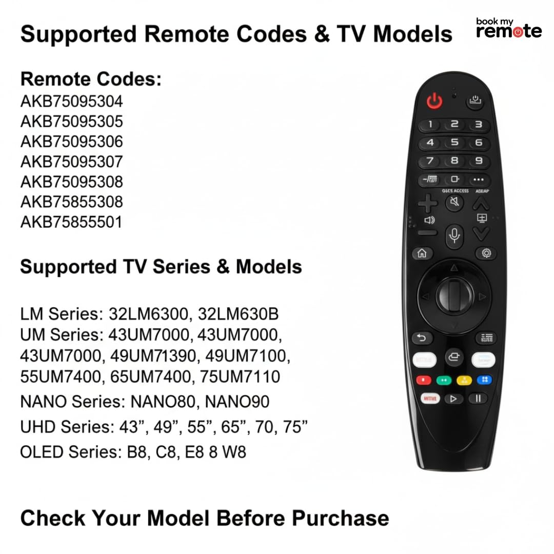 This Book My Remote™ replacement is designed for LG webOS TVs that support AN-MR20GA and AKB75855501 remotes. It works with a wide range of LG Smart TV series, including: LG OLED Series (select models) LG NanoCell Series (select models) LG UHD 4K Smart TV Series (select models) Other LG webOS TVs that use AN-MR20GA or AKB75855501 remotes Always check your existing remote model code (printed on the back of the remote) or confirm in your TV manual before purchasing. Why Choose This Remote? If you have lost your original remote, if the buttons have stopped working, or if you need a backup, this replacement provides a reliable solution. It offers the same basic functions you need for everyday use, such as power, volume, channel, app shortcuts, and input navigation, without the extra cost of advanced features like voice or pointer control.
