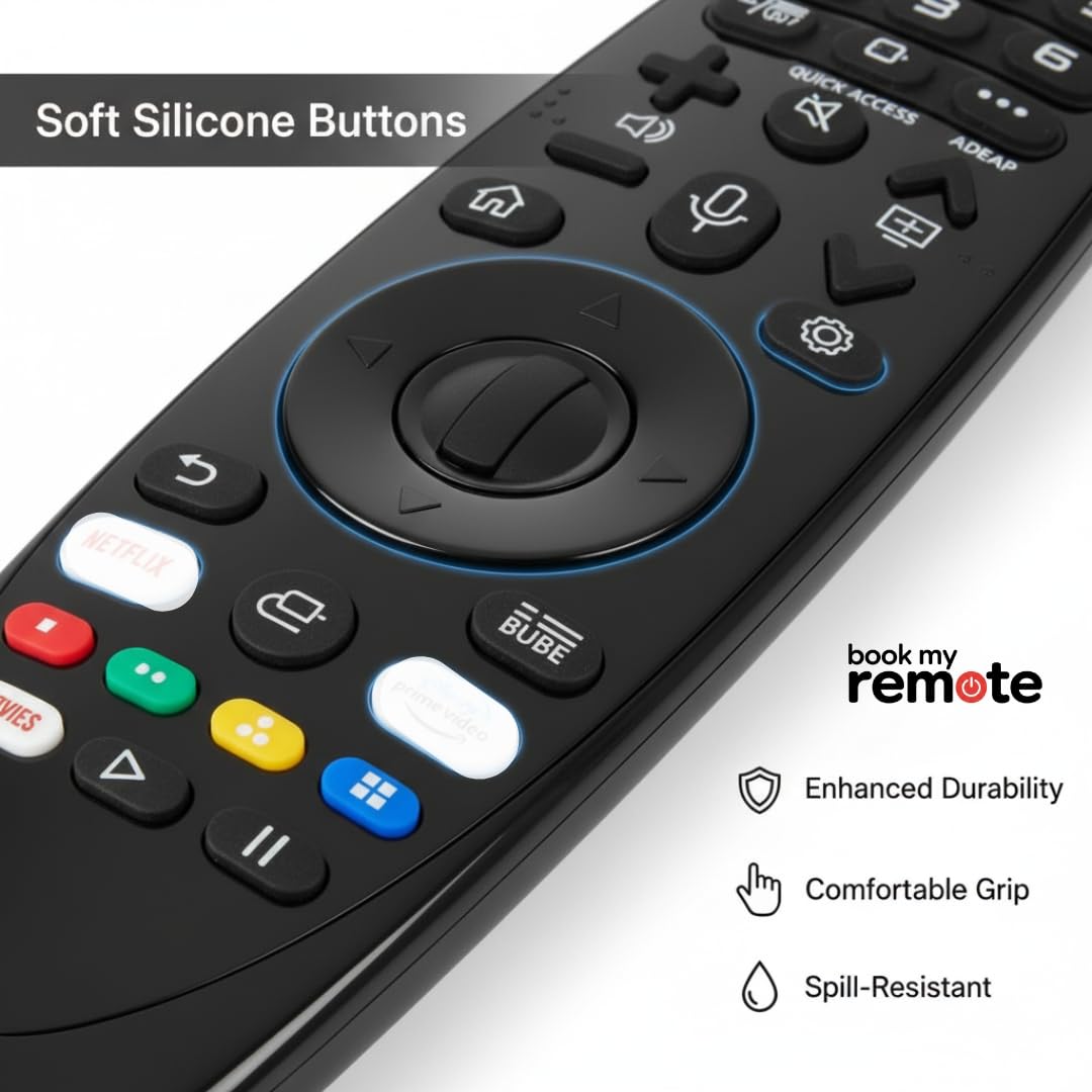 Book My Remote™ offers a high-quality compatible replacement remote control for LG webOS televisions. This model is designed to work with AN-MR20GA and AKB75855501 remotes, ensuring reliable compatibility across many popular LG TV series. It is an excellent choice if you need a simple, durable, and cost-effective replacement for your original remote.
