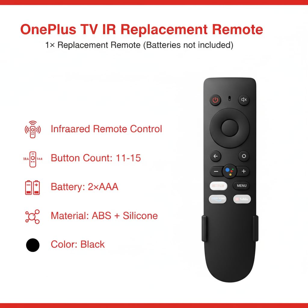Book My Remote OnePlus TV Replacement Remote Book My Remote brings effortless control back to your living room. Designed to match the original OnePlus Smart TV remote, this infrared (IR) non-voice remote gives you instant plug-and-play convenience without Bluetooth or pairing. Simply insert two AAA alkaline batteries and start using immediately — no setup, no hassle. This remote works perfectly with OnePlus Y Series models such as 32Y1, 40Y1, and 43Y1, and other compatible IR OnePlus TVs. It supports common remote codes RC-002B and RC-004B, offering the same layout and performance as your original remote. Enjoy one-touch access to your favorite streaming apps with dedicated hotkeys for Netflix, YouTube, and Prime Video. The infrared transmission provides reliable, lag-free performance from anywhere in the room, ensuring smooth, uninterrupted viewing every time. Crafted with a slim, lightweight, and ergonomic design, the remote feels comfortable to hold and easy to use for the whole family. The high-quality ABS and silicone construction ensures durability and long life, even with daily use. Each package also includes a free wall-mount holder so your remote stays organized, protected, and always within reach. Whether you’ve lost your original remote or just want a reliable spare, the Book My Remote OnePlus TV Replacement Remote is a simple, affordable, and dependable choice to keep your entertainment setup running smoothly.