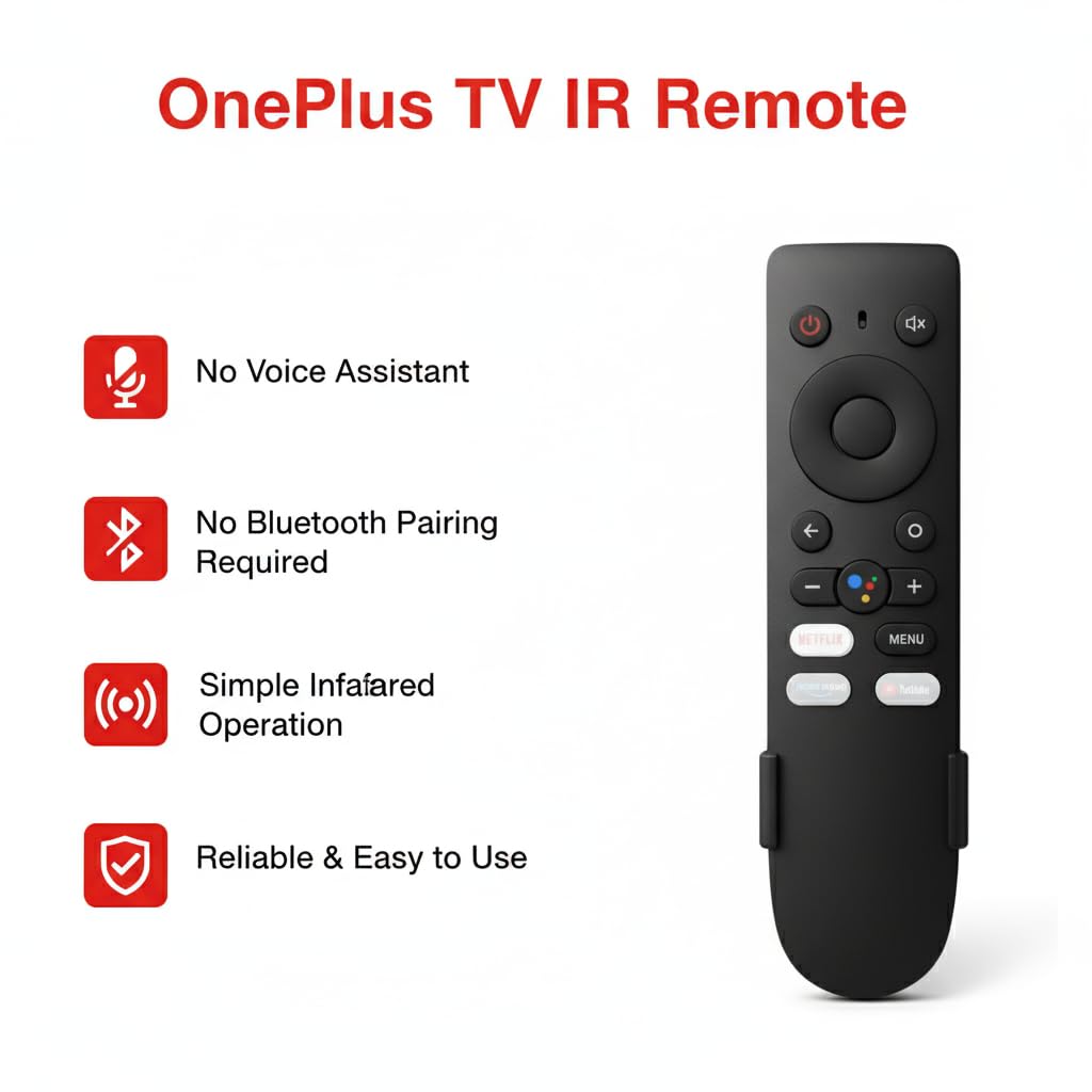 Plug & Play – no pairing or Bluetooth required Works with OnePlus Y Series 32Y1 / 40Y1 / 43Y1 Dedicated Netflix, YouTube, and Prime Video buttons Reliable infrared (IR) technology Lightweight, ergonomic design Includes free wall-mount holder