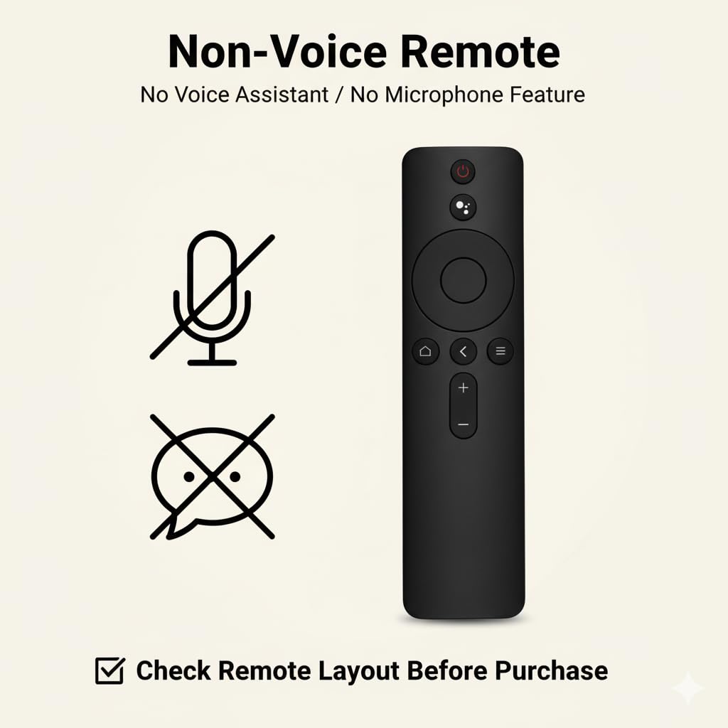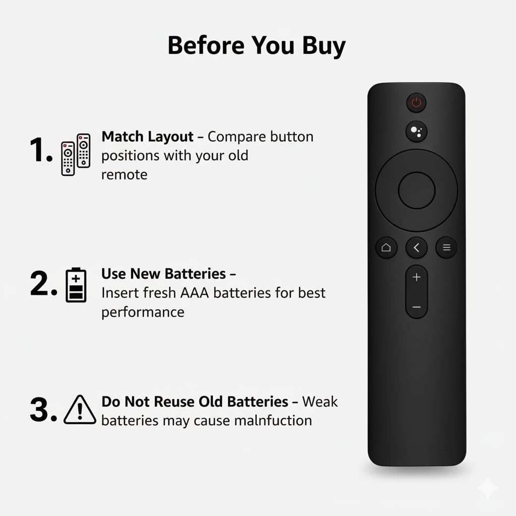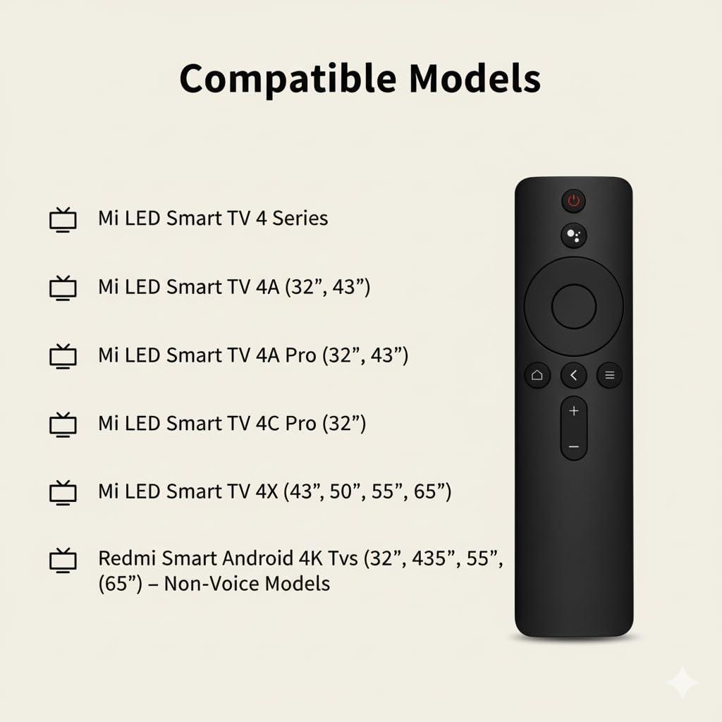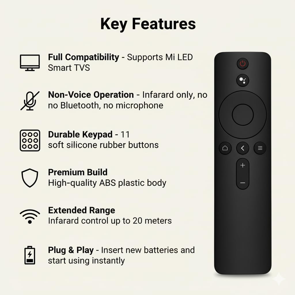 Book My Remote Compatible Replacement Remote for Mi TV 4A (32″/43″) and Mi LED Smart TVs is the perfect solution when your original remote is lost, damaged, or not working. Built with precision infrared technology and a durable design, this remote ensures smooth and reliable control of your Xiaomi Smart TV models. | Key Features & Benefits: | Full Compatibility Designed as a Mi TV remote replacement, compatible with Mi LED Smart TV 4A (32 inch, 43 inch), Mi TV 4A Pro, 4C Pro, 4X, and Redmi Smart Android 4K TVs (non-voice models only). | 20 Meter Infrared Range Advanced infrared remote control for Mi Smart TVs with up to 20m line-of-sight working distance. No Bluetooth or Wi-Fi required. | Non-Voice Remote This is a non-voice remote for Mi TV, meaning no microphone or voice assistant function. A simple, reliable solution. | Durable Button Design Equipped with 11 soft silicone rubber buttons for comfort, anti-wear, and long-lasting use. | Strong & Lightweight Build Made with high-grade ABS plastic body for durability while keeping the design lightweight and easy to handle. | Plug & Play Convenience No setup or pairing needed. Simply insert 2 AAA batteries (not included) and start using instantly. (Important: Do not reuse weak or old batteries.) | Instructions Before Buying: | Match Layout Ensure the button layout of your old remote matches this model. | Check Compatibility Works with Mi LED Smart TVs and Redmi Smart Android TVs listed above (non-voice models only). | Use New Batteries Always insert fresh AAA batteries for best performance. Do not use old or weak batteries as they may cause malfunction.