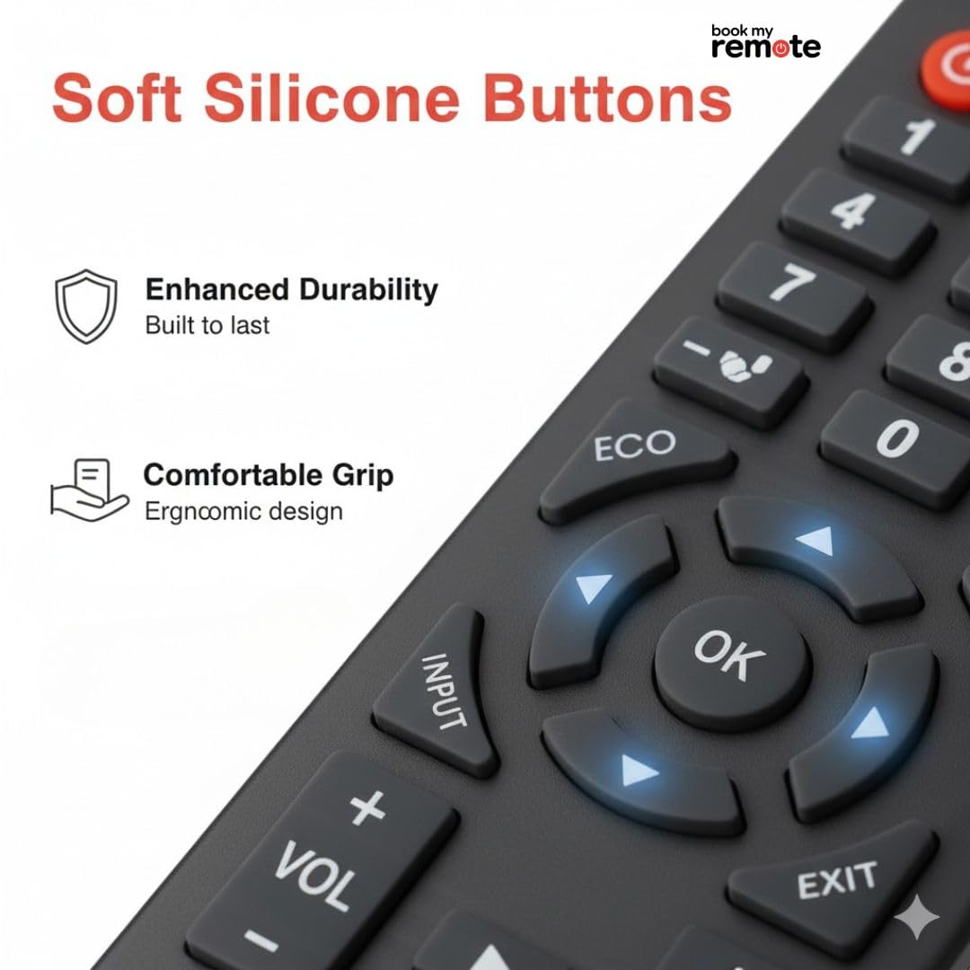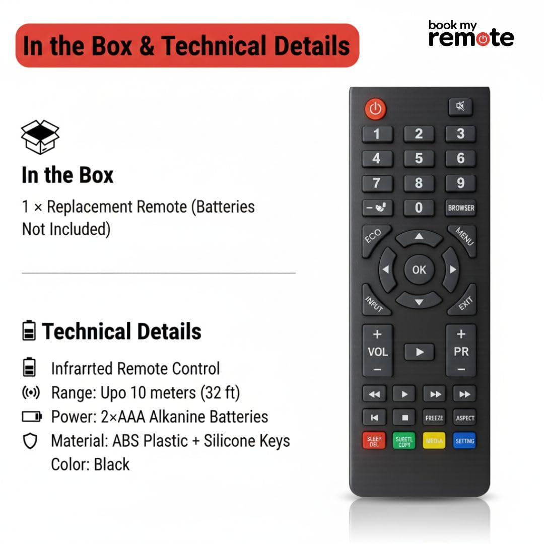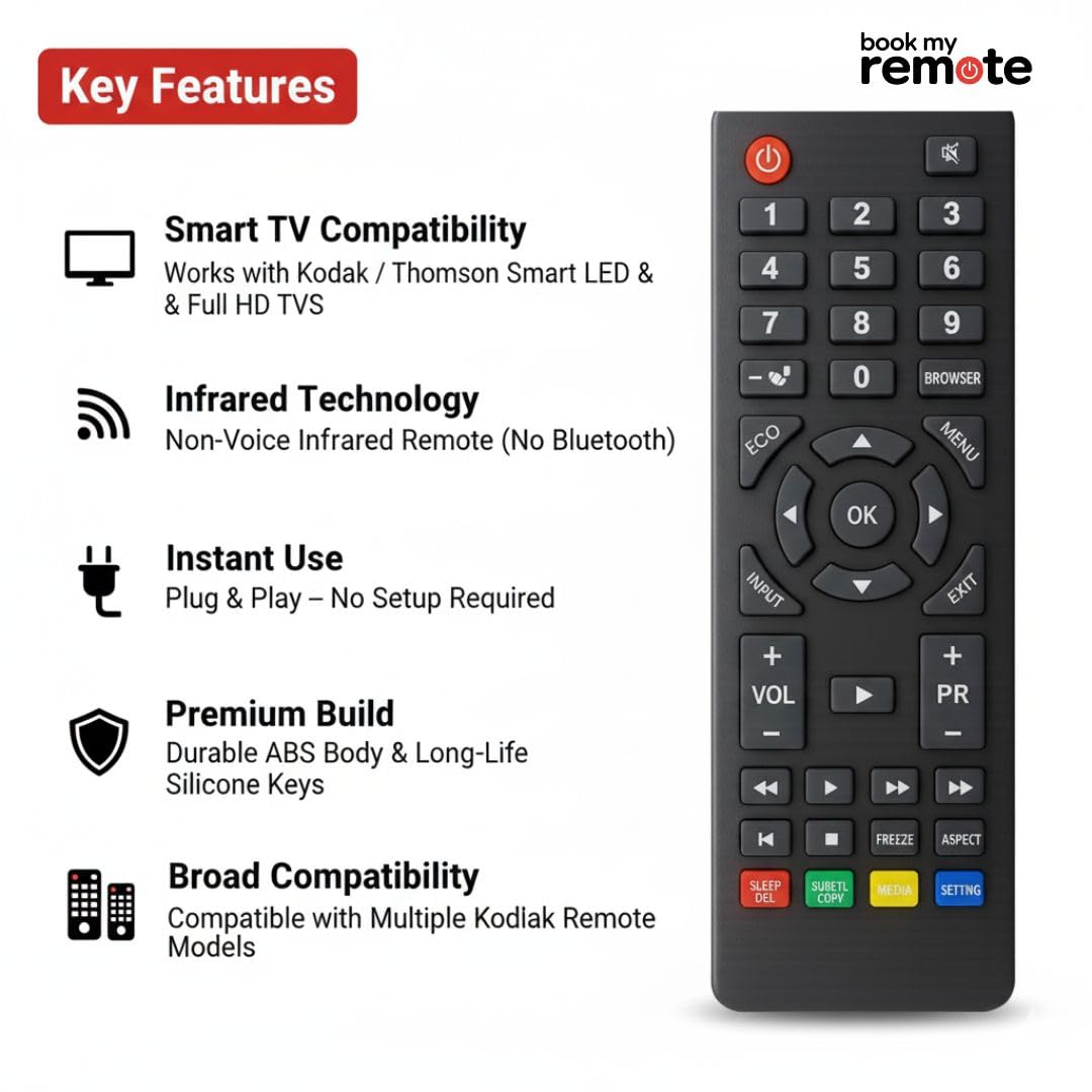 Bring back effortless control to your entertainment with Book My Remote your trusted replacement remote for Kodak TVs. | Designed for Kodak Smart, LED, LCD, Full HD, and 4K models, this remote control provides perfect compatibility and instant plug-and-play convenience. Simply insert two AAA batteries, and its ready to use no pairing, no setup, no waiting. | Powered by advanced infrared (IR) transmission technology, it delivers instant, accurate signal response from up to 10 meters away, allowing smooth navigation and uninterrupted viewing. | Its durable ABS body and soft silicone buttons provide comfort and long life, while its spill-resistant design ensures daily reliability. Every unit is tested before dispatch, ensuring that you receive a product that just works every single time. | Whether youre replacing a lost or damaged Kodak remote or simply need a dependable backup, Book My Remote gives you the perfect balance of performance, build quality, and peace of mind. | Simple. Reliable. Built for Kodak.