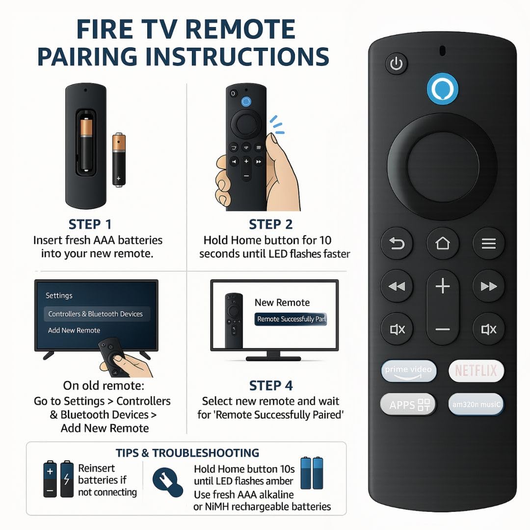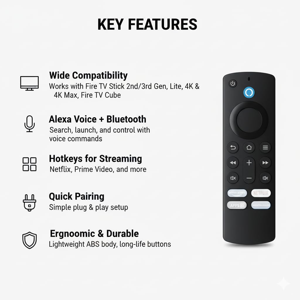 Fully compatible with popular Fire TV Stick, Fire TV Stick Lite, Fire TV Stick 4K/4K Max, and Fire TV Cube generations. Alexa Voice Button lets you search shows, control playback, and open apps hands-free. Dedicated Hotkeys for Netflix and Prime Video deliver instant entertainment access. Quick pairing with Bluetooth + IR ensures stable connectivity and fast response. Ergonomic, durable build with 11 tactile buttons for reliable everyday use.