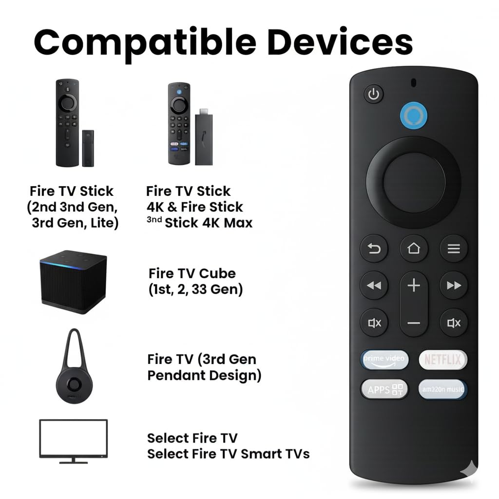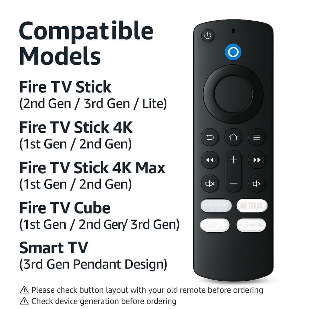 ✔ Fire TV Stick (2nd Gen / 3rd Gen / Lite) ✔ Fire TV Stick 4K (1st & 2nd Gen) ✔ Fire TV Stick 4K Max (1st & 2nd Gen) ✔ Fire TV Cube (1st / 2nd / 3rd Gen) ✔ Fire TV (3rd Gen Pendant Design) ✔ Select Fire TV Smart TVs ⚠️ Not compatible with Fire TV Stick 1st Gen or Fire TV Edition Smart TVs. Always confirm button layout with your old remote before ordering.