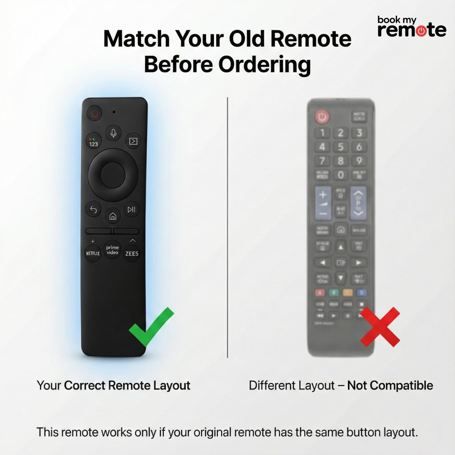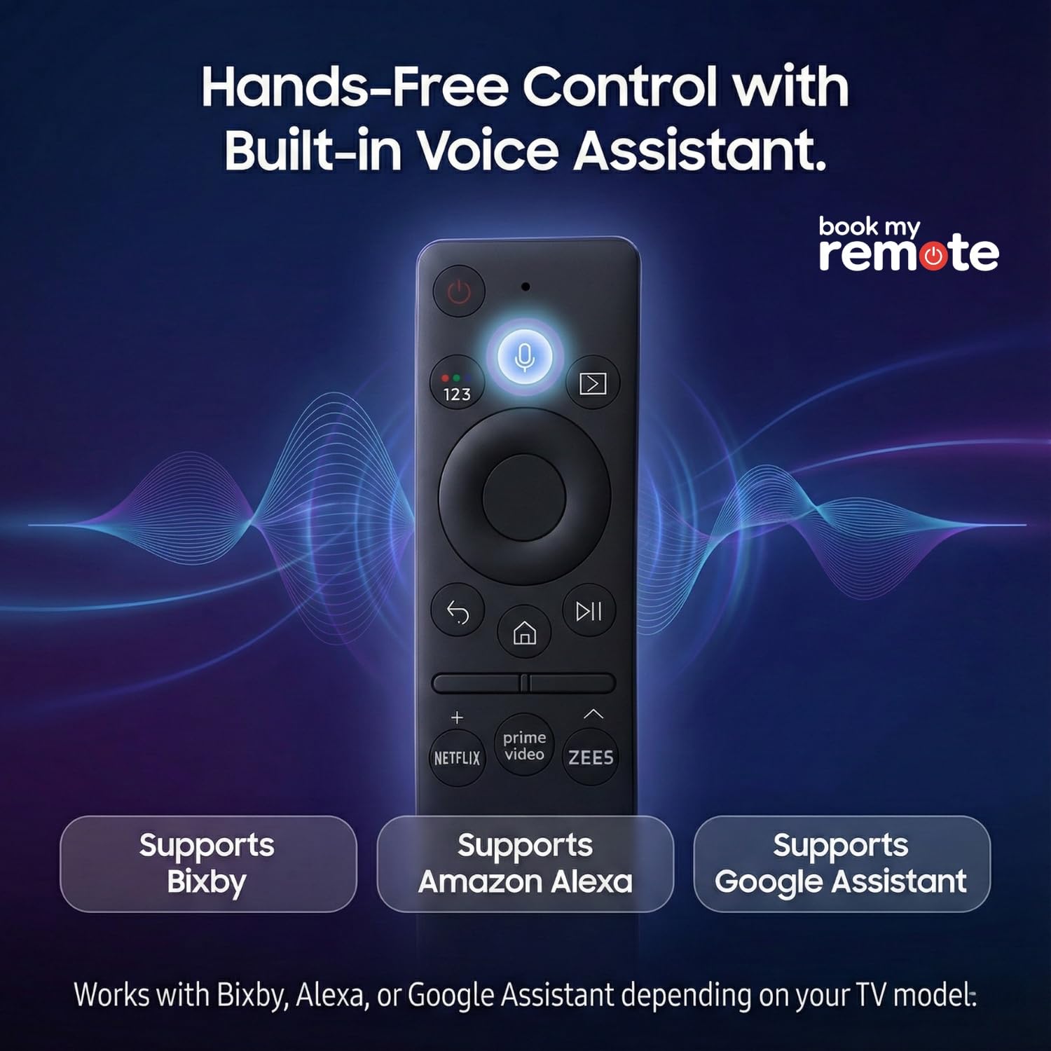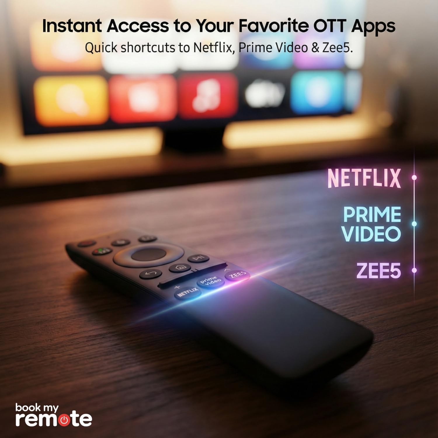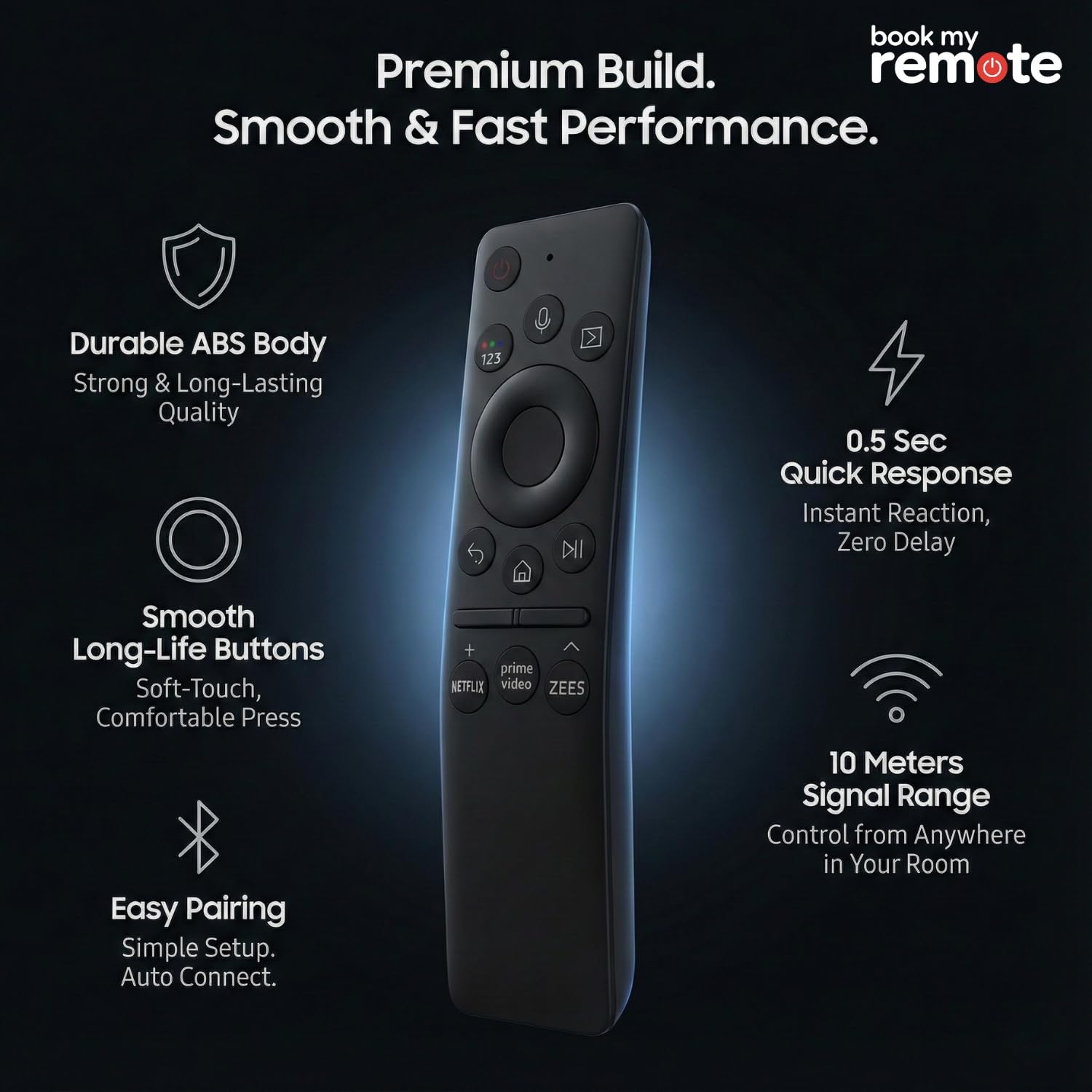 The Book My Remote Smart Voice Remote is a Bluetooth replacement remote designed for Samsung Smart TVs from 20182023. It offers fast wireless response, voice control support, and an ergonomic button layout similar to the original Samsung remote. Pair quickly by holding the Return and Play/Pause buttons. Supports Netflix, Prime Video and Zee5 hotkeys. Built with durable ABS body and soft-touch buttons for long life.